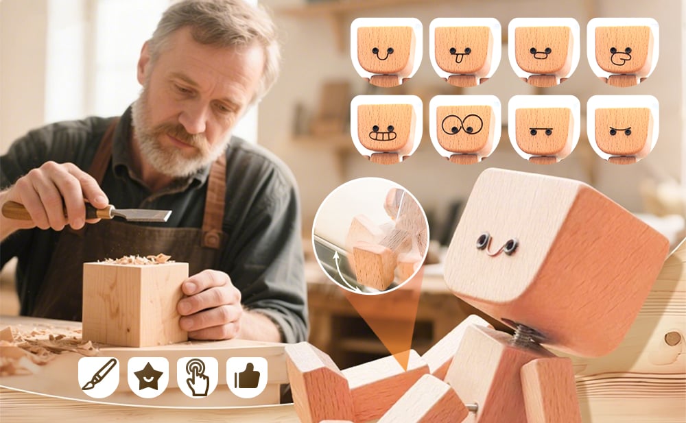 cada boneco de madeira feito à mão é meticulosamente trabalhado em madeira natural premium